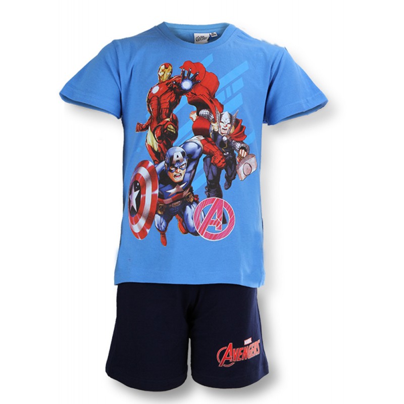 Boys short pyjama set depicting Marvel Avengers characters Captain America, Ironman and Thor.