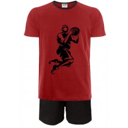 Show your love for basketball with this stylish and comfortable pyjama set. The red shirt features a striking black silhouette design of a basketball player in action, set against a vibrant red background with a contrasting black neckline trim. The shirt is crafted with high-quality cotton material and reinforced stitching for durability, as shown by the detailed hemming. Paired with classic black shorts that offer both comfort and flexibility, this set is perfect for lounging or sleeping. The shorts come with an elastic waistband for a secure, adjustable fit and are made from soft, breathable fabric. Both pieces are designed by Jujak to provide ultimate comfort during rest and relaxation. This sporty sleepwear combination offers both style and functionality, making it an excellent choice for basketball enthusiasts or anyone seeking comfortable nightwear with an athletic aesthetic.