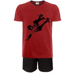Show your love for Extreme Sports with this stylish and comfortable pyjama set. The red shirt features a striking black silhouette design of a Skateboarder, set against a vibrant red background with a contrasting black neckline trim. The shirt is crafted with high-quality cotton material and reinforced stitching for durability, as shown by the detailed hemming. Paired with classic black shorts that offer both comfort and flexibility, this set is perfect for lounging or sleeping. The shorts come with an elastic waistband for a secure, adjustable fit and are made from soft, breathable fabric. Both pieces are designed by Jujak to provide ultimate comfort during rest and relaxation. This sleepwear combination offers both style and functionality, making it an excellent choice for sports enthusiasts or anyone seeking comfortable nightwear.
