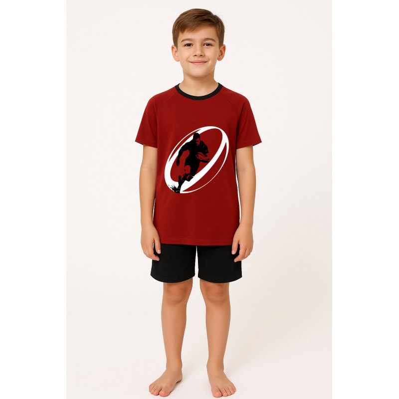 This vibrant boys' rugby short pyjama set from Jujak combines sporty style with comfortable sleepwear. The eye-catching red t-shirt features a dynamic rugby player graphic encircled by a bold rugby ball design, perfect for young sports enthusiasts. The contrasting black trim at the neckline adds a smart finishing touch, whilst the matching black shorts complete this coordinated set. Part of the premium sports range, these pyjamas are designed with raglan sleeves for enhanced freedom of movement during sleep. The short-sleeved top and shorts make this set ideal for warmer nights or year-round comfort in heated homes. Whether your child dreams of scoring the winning try or simply enjoys the thrill of rugby, this pyjama set lets them showcase their passion for the sport even at bedtime. The comfortable fit ensures a restful night's sleep, whilst the quality construction means this set will withstand regular washing and wear.