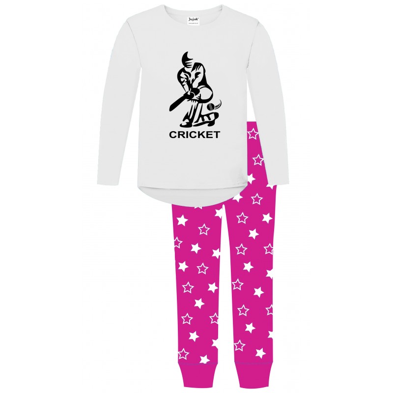 Girls cotton pyjama set with a white top and pink & white trousers.