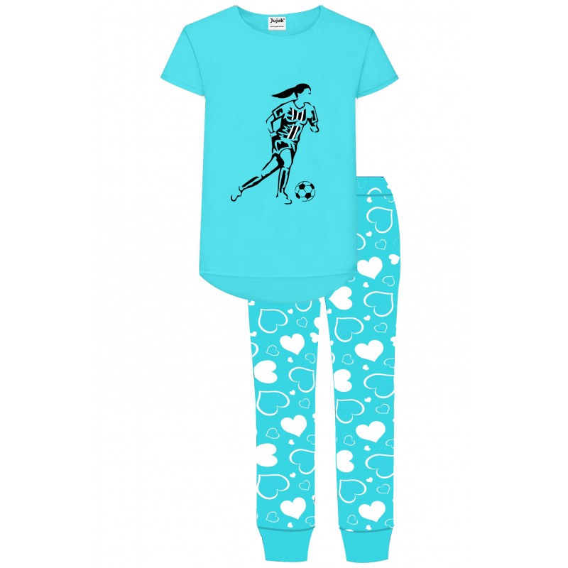 Girls cotton pyjama set with a white top and pink & white trousers.