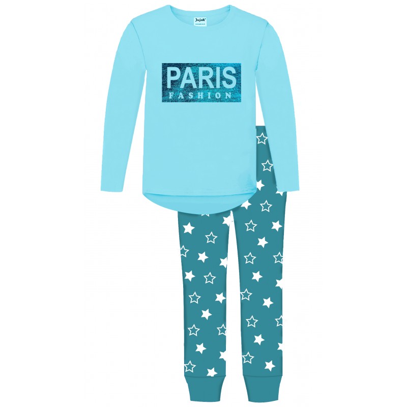 Set has an aqua blue top and teal & white patterened trousers.